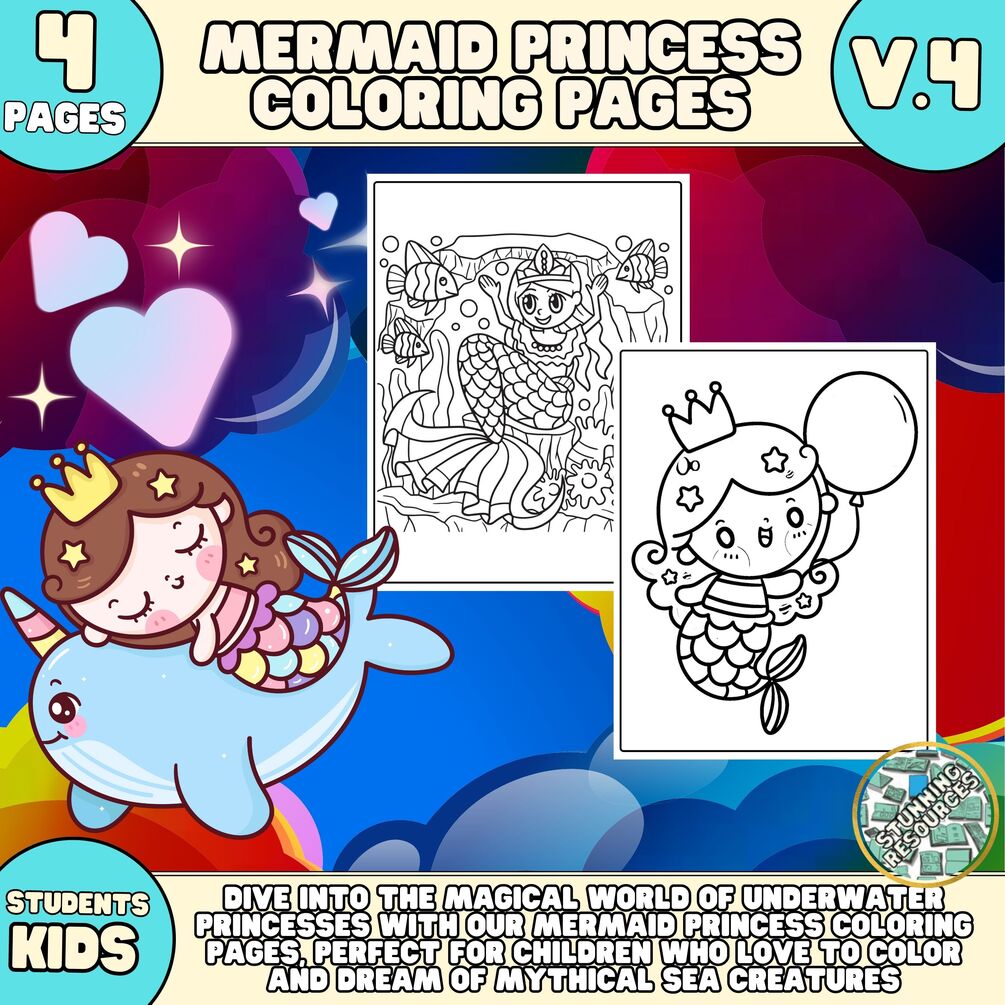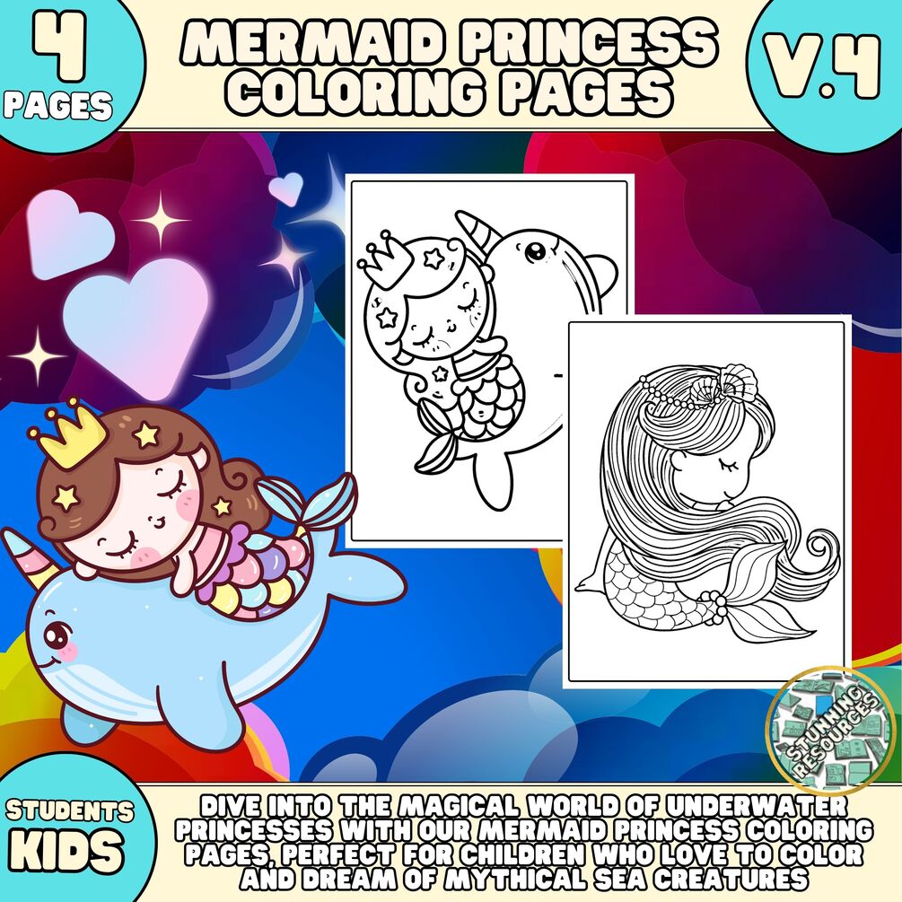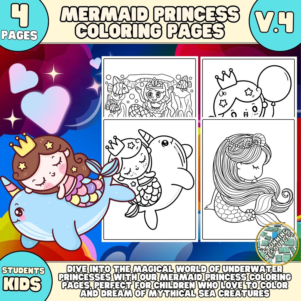 Mermaid Princess Coloring Pages V.4, Mermaid Coloring Book for Kids